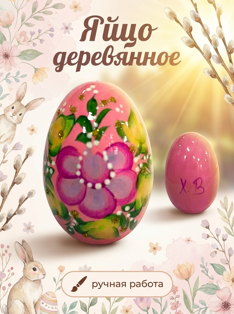 Яйцо дерево руч. роспись розовое 55х39 мм
